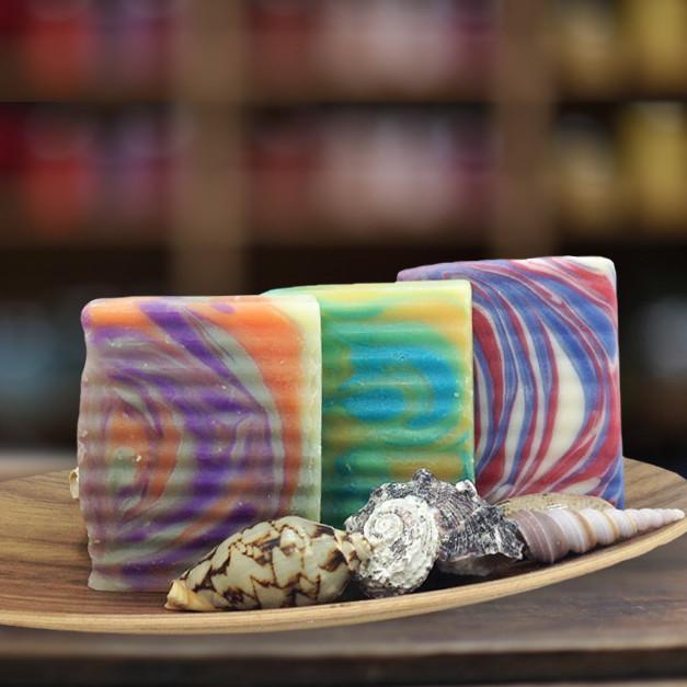 In the soap examples photo, the darkest intense color is equal to one sample bag of pigment per pound of oils and the lightest color is equal to approximately 1/2 teaspoon or 1/6th of a sample bag of pigment per pound of oils.