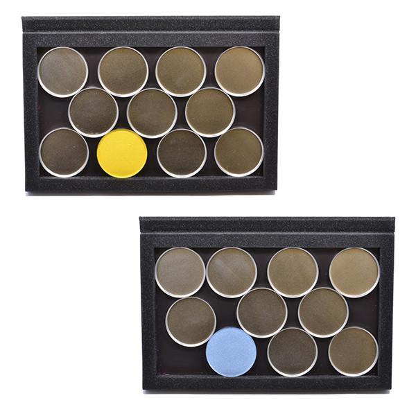 Plus One tins are 37mm round tin pans which fit MAC sized palettes. In the additional photos note that the Yellow Powder is in our 36mm pans, the Blue Powder is in our Plus One Pans.